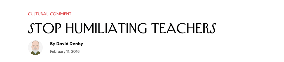In questo articolo mi propongo di esaminare l’efficacia e i limiti dell’etica deontologica dell’insegnante, intesa come quell’insieme di doveri formalmente sanciti – nei codici professionali, nelle normative e nei regolamenti – che dovrebbero orientare la condotta di chi esercita la professione docente. Per dare concretezza alla riflessione, prenderò come punto di riferimento il testo di David Denby, Stop Humiliating Teachers, pubblicato sul New Yorker l’11 febbraio 2016. Questo articolo, pur non esplicitando una teoria etica, rappresenta un caso paradigmatico di come il contesto sociale e politico in cui opera l’insegnante possa influire in modo decisivo sulla possibilità stessa di adempiere ai doveri professionali in modo coerente con la finalità educativa della scuola.
