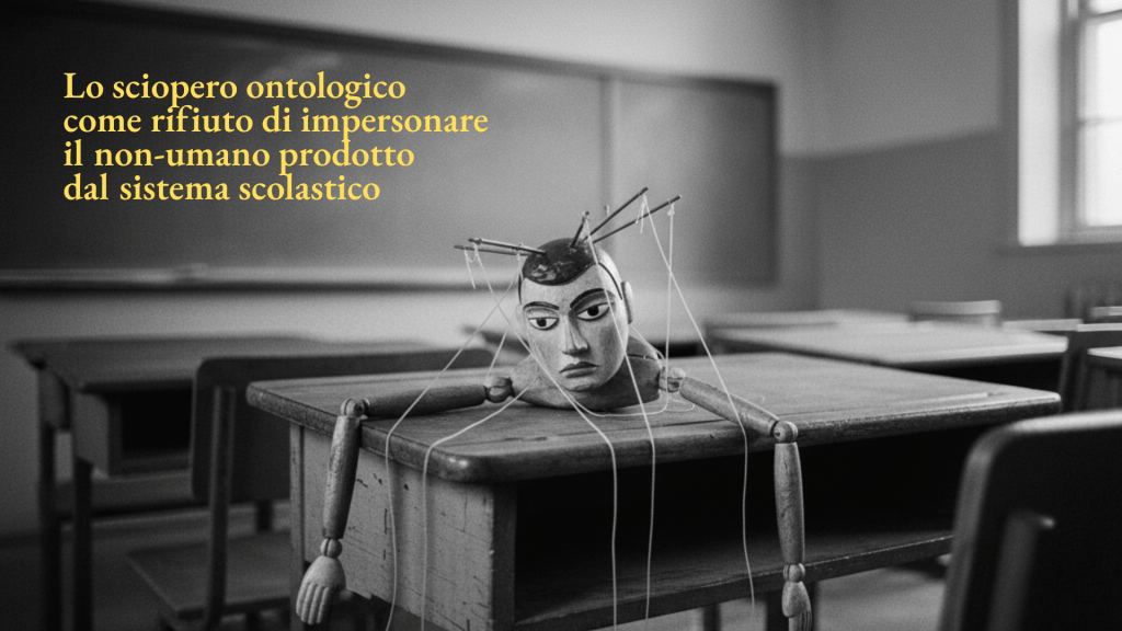 A queste forme di resistenza si aggiunge lo sciopero ontologico, che non è una semplice astensione dal lavoro, ma la sospensione del ruolo reificato che il sistema attribuisce all’insegnante. È il rifiuto di ridursi a marionetta di metriche e procedure, il gesto con cui il docente sottrae la propria presenza viva alla logica che lo vuole ingranaggio impersonale. Scioperare ontologicamente significa smettere, per un istante, di impersonare il “non-umano” che il sistema scolastico produce, per riaffermare che l’insegnamento è relazione, parola propria, testimonianza. È l’atto con cui l’umano, reificato, torna a manifestarsi come irriducibile.